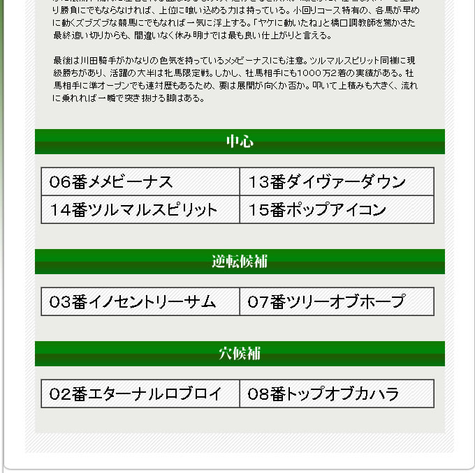競馬勝馬予想ブログ 的中一徹!競馬の勝馬を様々なデータを集めて予想します。 いろんな競馬予想サイトのデータや買い目を参考にして、勝馬を的中させてみせます。PAGE | 140 139 138 137 136 135 134 133 131 130 129 | ADMIN | WRITE 2012.08.22 Wed 18:38:55 新潟2歳ステークスの勝馬予想先週の反省先週の反省としては、ワイドの相手に3歳馬を選んだのは間違いなかった。 大穴シゲルスダチとエピセアロームは見事入賞。 んがしかし 軸にジュエルオブナイルは凡走。 ハイペースのレースに完全についていけなかった。 先行馬は全滅だ。 傾向の一つの中に8枠の好走率が非常に良いことが掲載されていた。 今回勝利したスギノエンデバー、入賞したエピセアロームはともに8枠。 3連複が狙えた馬券だっただけに、今回は本当に反省だ。 新潟2歳ステークスさぁ、新潟2歳ステークス。 勿論このレースも荒れるレースの一つ。 1番人気は入賞率は高いが2桁人気も過去5年で食い込んできているため注意が必要なレースだ。 1番人気の連対率は60%。これを見る限り間違いなく1番人気は買い目に加えておきたい。 そして同じく4番人気も。4番人気は過去10年で3頭の勝馬を出している。 しかしそのほかのデータではかなり実力は均衡している。 関東馬関西馬の勝率はほぼ同じ、牡馬牝馬有利不利無し。 勝馬の脚質は先行~追い込みまでの馬だ。 しかし、若い馬はどのような走らせ方をするか悩んでいる状態だからな。 恐らく前走と同じように走れるとは考えないほうがいい。 前走の実績は勿論1着が良い。 過去10年の実績では前走1着馬から9頭の勝馬が出ている。 前走どのレースを走っていたかはあまり気にするところではないだろう。 そして実績面で大きな傾向は、なんといっても新潟レースを体験しているかどういか。 今までの傾向では、新潟レースを走ったことがある馬の連対数が18。 つまり、勝馬のほとんどは新潟の競馬を経験している。 今回登録されている馬で新潟を経験している馬は13頭。 これは出走登録が改めて決まってから、もう一度情報をまとめたほうが良さそうだな。 馬券トピックス最近私が使っている競馬予想サイトでお薦めに競馬予想サイトは、馬券トピックスというサイトがお薦めできる。 このサイトは、有料情報を買わずとも注目馬だけでよけらば、無料で毎週1日4Rも貰える。 この無料情報が思った以上に当たっているのだ。 先週も土曜日のレースを参考に見てみたのだが4R中3Rで注目馬の入賞が確認できる。思った以上に優秀なサイトだった。 【馬券トピックス】 PR CommentsComment Form |
