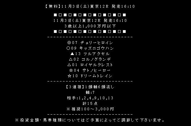 競馬勝馬予想ブログ 的中一徹!競馬の勝馬を様々なデータを集めて予想します。 いろんな競馬予想サイトのデータや買い目を参考にして、勝馬を的中させてみせます。PAGE | 6 7 8 9 10 11 12 13 14 15 16 | ADMIN | WRITE 2012.11.05 Mon 19:01:41 11月3日の東京12Rは無料情報で万馬券!!今回は私が最近使っている競馬予想サイトの無料情報が見事に的中したので、読者の皆さんにもオススメしたいと思う。