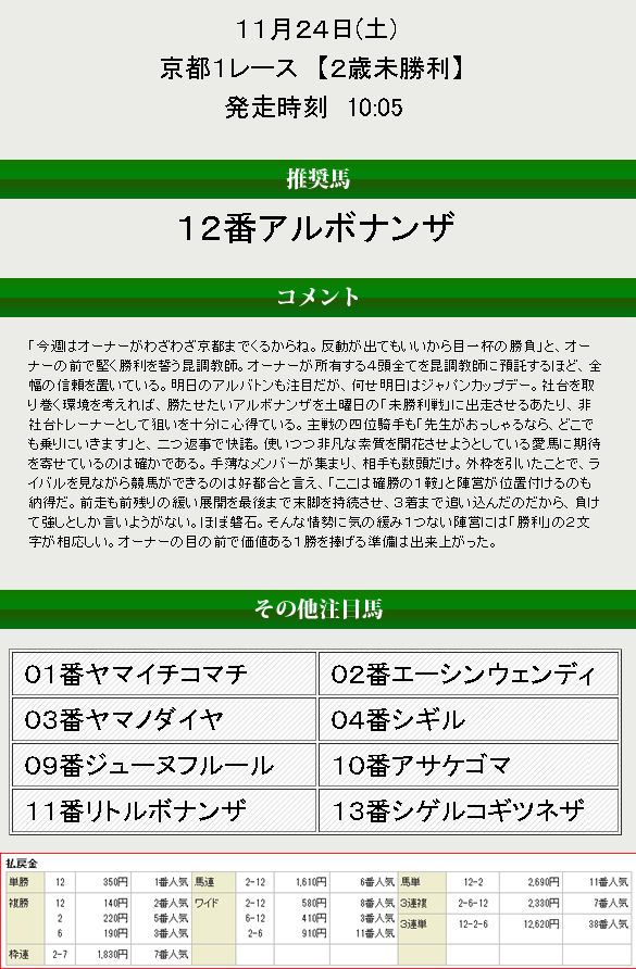 まずは的中した予想情報を下の画像から確認して頂きたい。 競馬予想サイトを使う理由はいくつかあると思うが、その1つに通常では入手できないような情報を入手できることが挙げられる。私もそれを目的としていることが多い。 なぜ12番アルボナンザなのか?上の画像で貼った予想情報では、なぜ12番アルボナンザを推しているのかというと、それは馬主が競馬場に足を運ぶからだそうだ。馬主が見に来るようなレースでは厩舎側も本気で勝ちに来ることが多く、勝負がかりになる。 このような情報を知っているか知らないかでは、馬券の的中に大きく影響すると言って良い。そのため、馬主が見に来るというような情報を入手することが馬券を的中させる近道と言っても過言ではない。 しかも、この馬券トピックスではこの情報を無料で提供している点が素晴らしい。様々な競馬予想サイトを見てきたが、このような有益な情報を無料で提供しているようなサイトは本当に少なく、一部の優良サイトだけだ。ほとんどの競馬予想サイトは不確かな情報で高額な情報料を巻き上げているので、皆さんには注意をしていただきたい。 馬券トピックスとは?それでは今回紹介した競馬予想サイト「馬券トピックス」について、どのような特徴を持ったサイトなのかを書いておこう。 【無料情報は3つ有り】 ●読馬裏(ドクバリ)・・・土曜日メインレース馬券考察(金曜日更新) ●モーニングプラン・・・1~6レースの無料馬券情報(金・土更新) ●アフターヌーンプラン・・・7~12レースの無料情報・馬券情報(金・土更新) 詳細はこちら⇒「馬券トピックス」 今回的中した無料情報は「モーニングプラン」から提供されたものだったが、これ以外の無料情報にも注目すべきだろう。有料情報はポイント制で1pt=100円となっていて、30pt(3,000円)から情報を購入することが可能で、とてもリーズナブルな印象だ。 興味のある方はどのようなサイトなのか、自分の目で確かめて見ることをオススメする。 PR 2012.11.24 Sat 16:45:03 11月25日のジャパンカップでオルフェーヴルが1着ではないとしたら?明日は世界中のホースマンも注目するビッグレースである「ジャパンカップ」が開催される。今回のジャパンカップの見所はなんと言っても、そのメンツの良さだろう。今回のジャパンカップに出走している日本馬は現役最強メンバーと言っても過言ではない。特に注目されているのは、やはり凱旋門賞で惜しくも2着と敗れたクラシック三冠馬のオルフェーヴルだ。